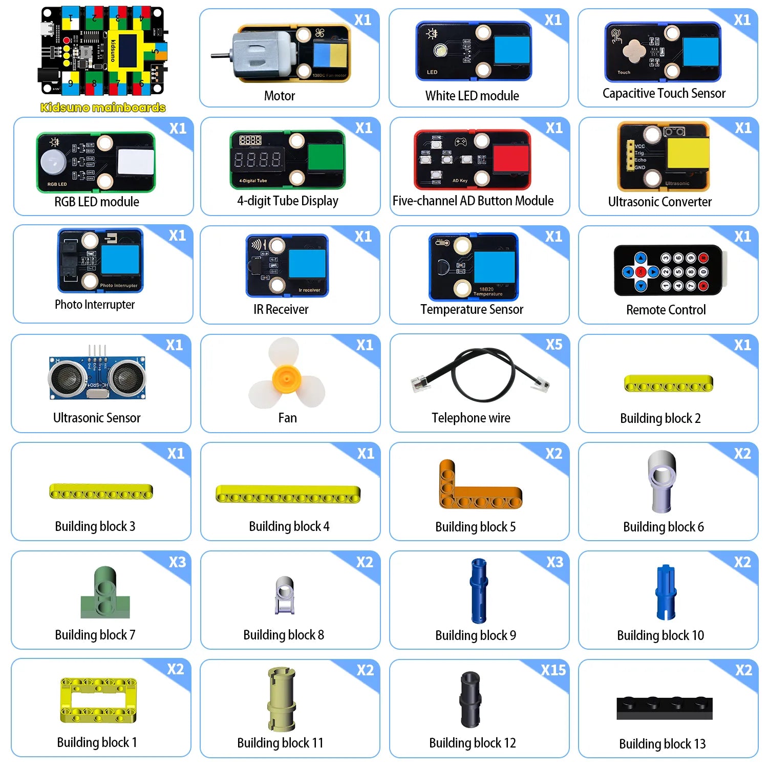 Includes: UNO-compatible board, smart fan module, sensors, and connectors